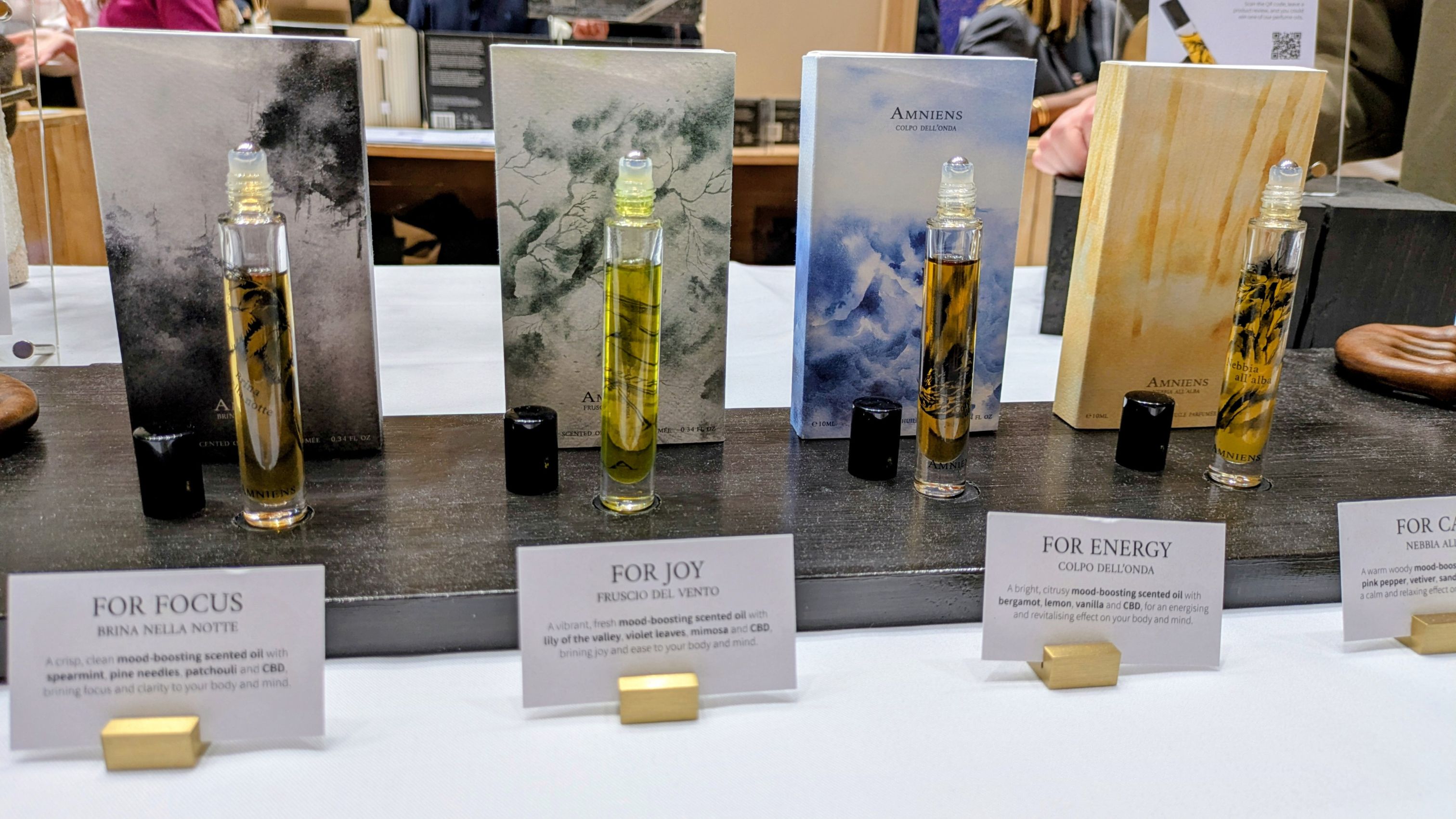 A different, more concept-driven approach was visible in the newly launched brand Amniens. Their collection is built around the effect of scent on mood, with fragrances designed to support states such as focus, joy, energy, and calm—moving beyond traditional aromatherapeutic blends toward compositions that function more clearly as perfumes.